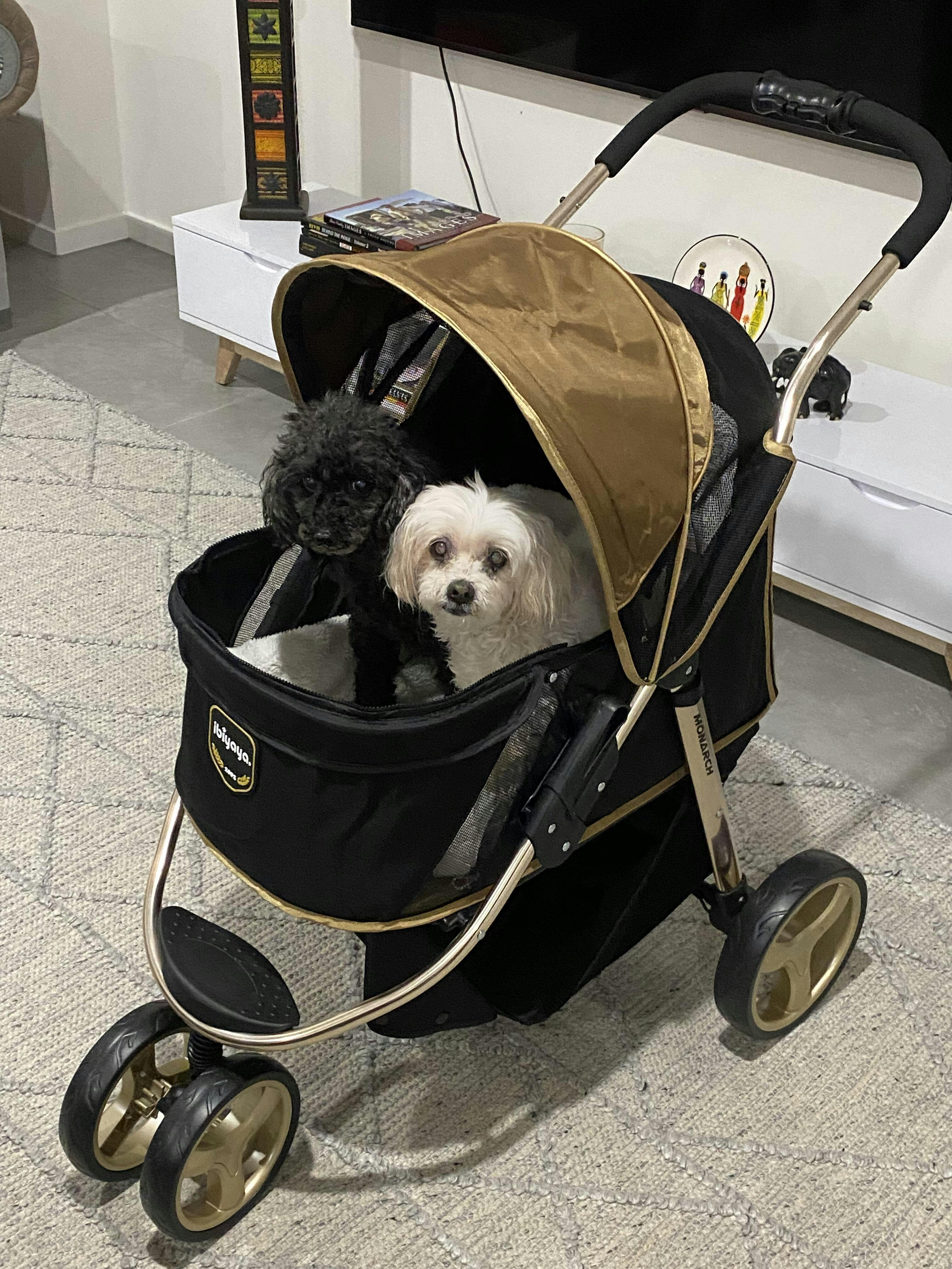 I ordered the pram on a Sunday evening and it arrived on the Tuesday of the same week. The Monarch Jogger pram is perfect for her, and I’m able to go “off road” with it so that my other dog doesn’t miss out on his nice walks. Bridie loves her pram and I know she feels safe and included despite her sudden blindness.